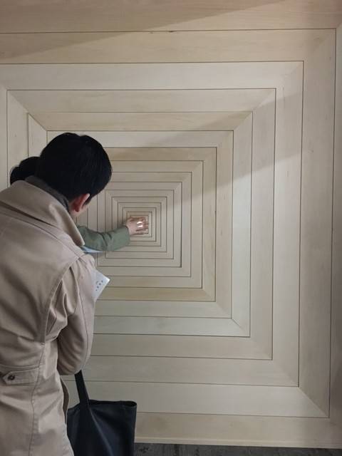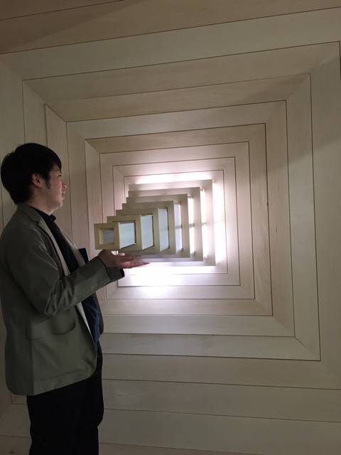 伸びてきました。「建具の縁」というタイトル。縁側を内包したような建具の可能性を追求した作品だそうです。伸びた穴を覗くと小さく小さく外の景色が見えました。