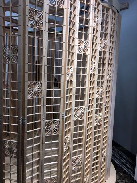 あの“ななつ星”にも採用された繊細で美しい大川組子。それを建具に取り入れたものです。上部に金物がついており、パーテーションのような使い方ができる建具でした。建具というよりも芸術作品を見ているようでした。