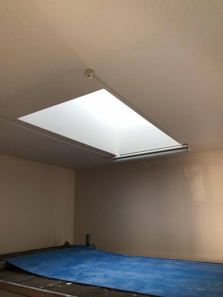 東区名島の戸建リノベーションの工事。今週は天窓のロールスクリーン設置工事を行いました。