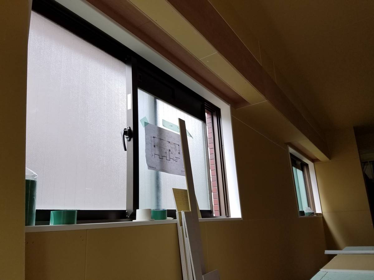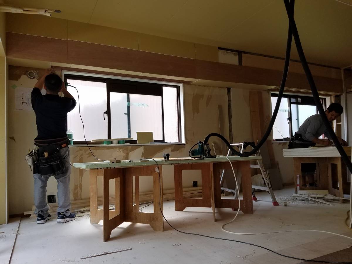 造作工事が進んでいる西新のマンションリノベーションプロジェクト。天井下地、壁下地の造作工事が終わってボード貼りが始まりました。