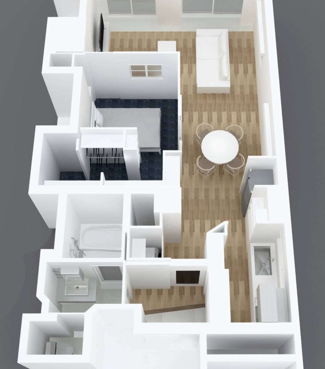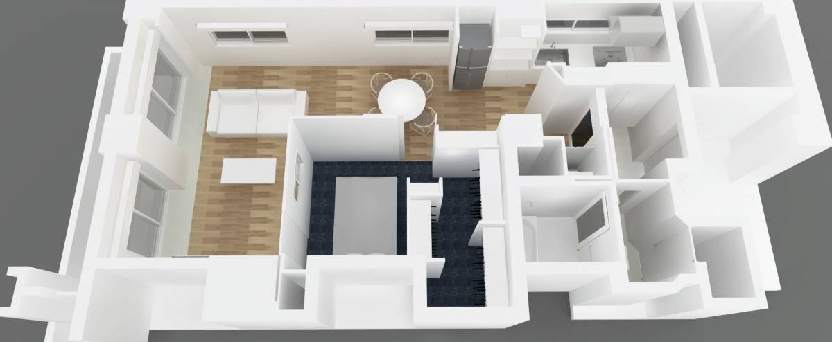 こちらは模型のような平面のCGです。戸建ての新築住宅の打ち合わせでは模型を使って内部のみならず外観や屋根、全体像をご提案するのが当たり前ですが、それを一部マンションのリノベーションでも取り入れてみました。