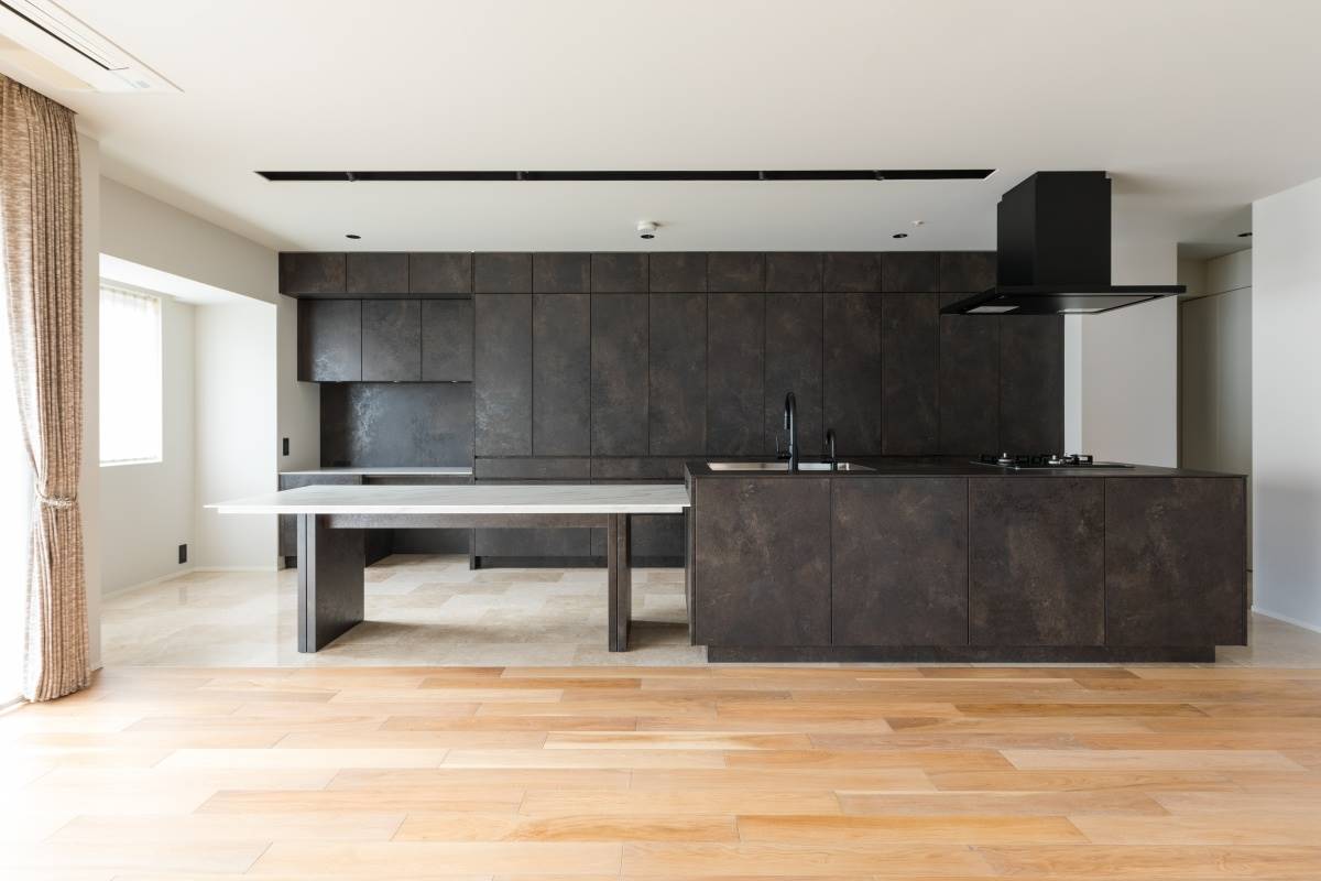 キッチンとトイレの床にもCQ STONEという新しい商材を使いました。天然石でありながらシート状で施工しやすいというのが特徴です。床暖房にも対応可能で、今後のリノベーションにおいても積極的に使っていきたい床材です。床を石にしたいけど全部の面積に貼るのは足が冷たくなりそうで抵抗がある…ということで、キッチン廻りだけ石を貼りました。油汚れや水汚れも掃除がしやすくメンテナンス性が良いと思います。新築マンションでこのように一部分床を違う素材で貼り替えることは、できないですよね。マンションで床材壁材も自由自在にデザインできるのは、リノベーションだけです。