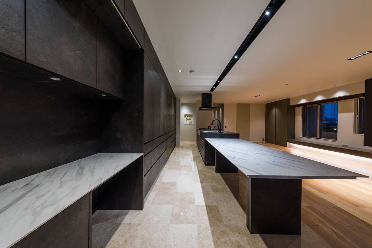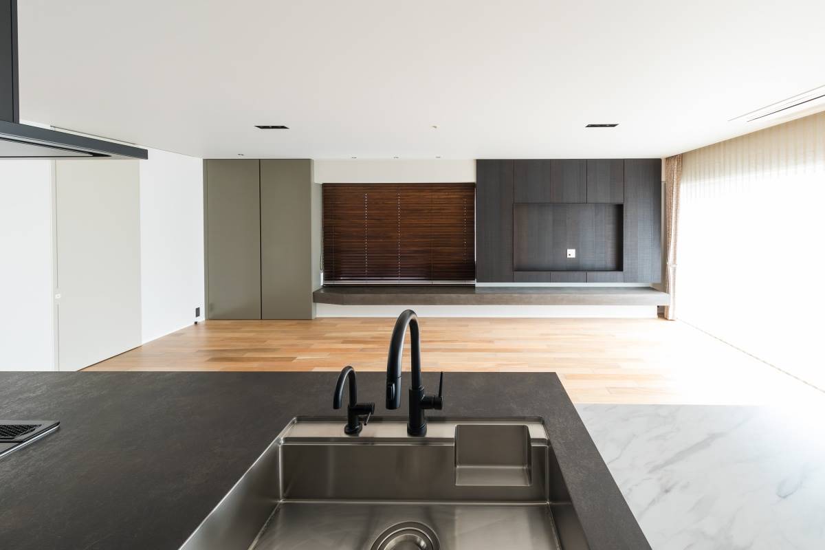 迫力のあるキッチンハウスのキッチンに負けないような存在感のある壁面にする必要がありましたので、テレビボードの素材に徹底的にこだわりました。職人さんにも何度も色出しをしてもらい、最終的にニッシンイクスの黒系の突板を採用いたしました。