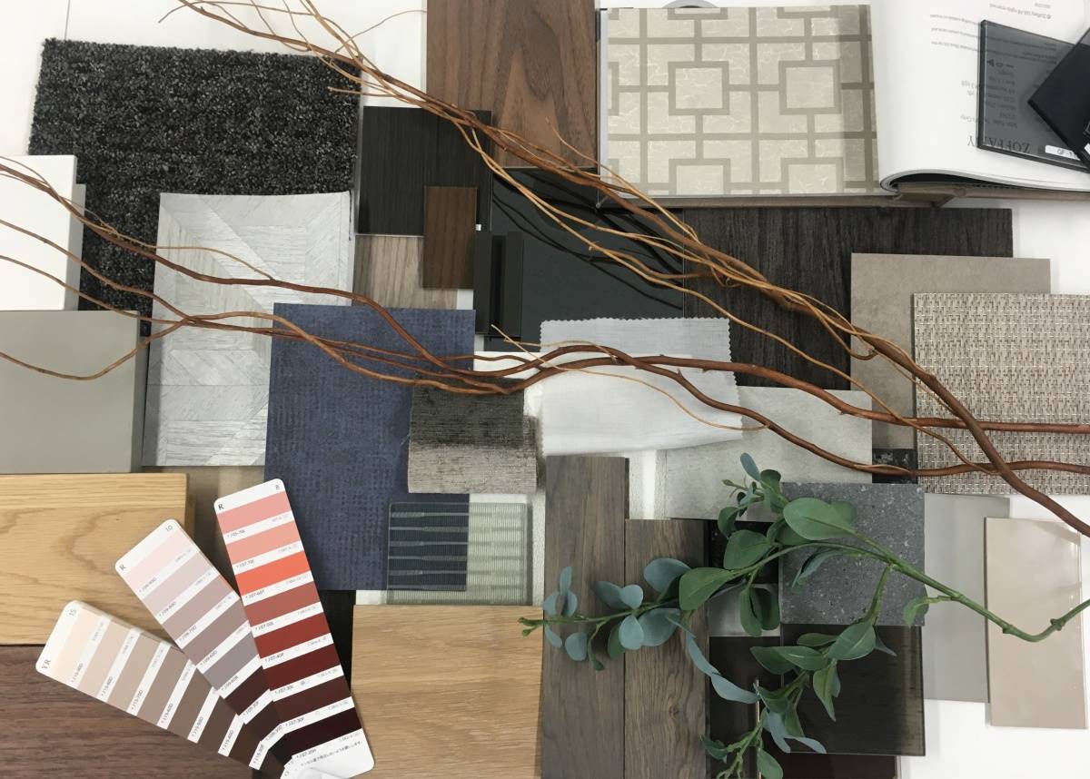 当社らしい黒やグレーをベースカラーにし、ダークトーンの赤や青などをアクセントとして取り入れます。標準仕様として使っている素材を使用しつつも、これまで使ったことのない石や塗料などをポイントとして使います。ヘリンボーンのフローリングやオークの床材など、特注の色にもこだわりました。石と突き板の組み合わせ、真鍮のアクセントなど、新しいデザインにも挑戦しています。