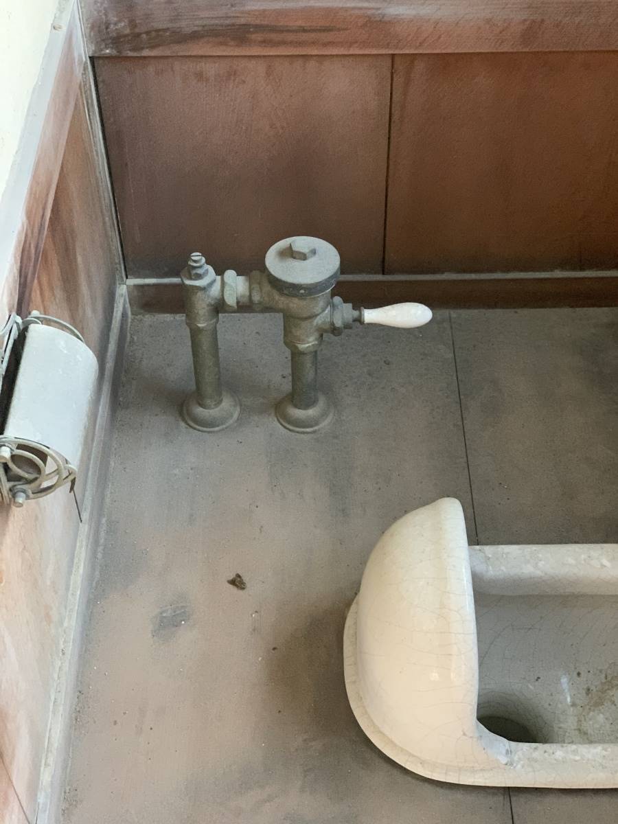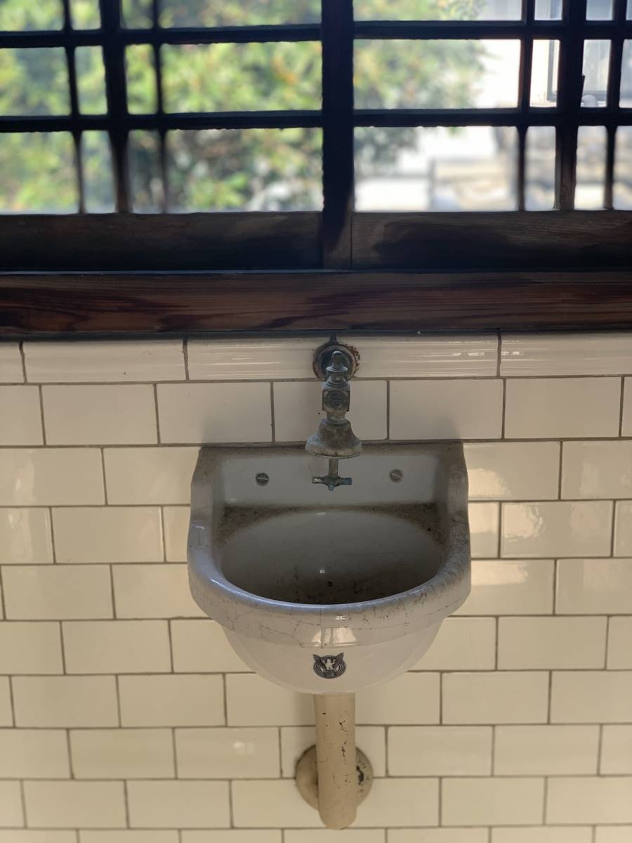 こちらはトイレ外の壁付け式手洗い器。中心にあるのは当時のTOTOのロゴです。調べたところによると昭和3年から36年の間の約30年間、このロゴだったようです。このロゴが刻印された陶器があるというだけで安蔵里がいかに古く貴重な建造物であるかが分かります。背面のタイルは、最近「サブウェイタイル」などという呼び方で流行っているタイルと全く同じですね。目地も薄いグレーでおしゃれ。