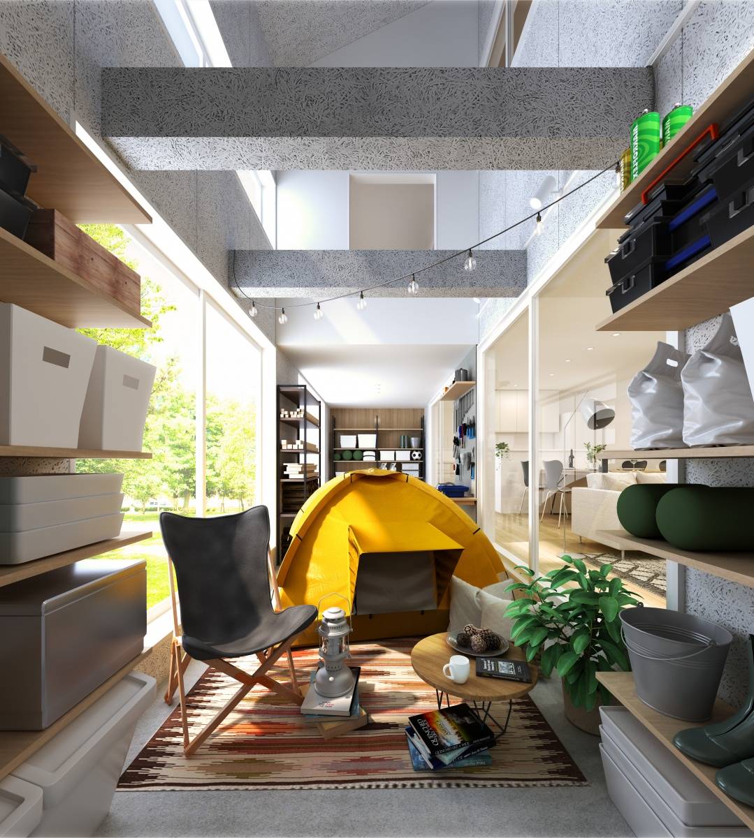 散らかりがちなキャンプ用品を収納するための空間。ついテントを広げてくつろぎたくなってしまいます。奥にはDIYを楽しむための場所を確保。木材や工具などを置いてガレージ風に使ってみては。