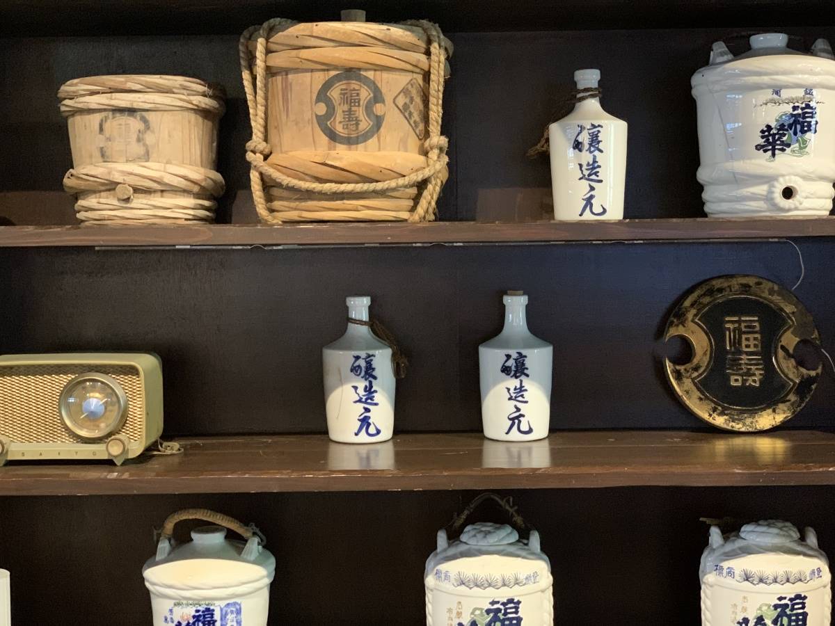 何気なく棚に並べられている瓶や樽。よく見ると、伊都安蔵里の前身である「福寿醤油」のマークがあります。瓶もどうやら福寿醤油の頃に使われていたもののようです。こんなに貴重な小物が飾られていたなんて!