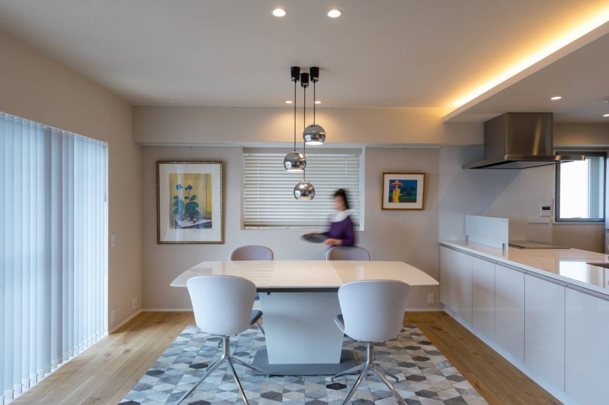 今回の西新のリノベーションプロジェクトでは、あらかじめご購入予定のダイニングテーブルやチェア、ペンダントなどがあり、それありきで空間の色合いやデザインを考え、全てを含めたインテリアコーディネートをしております。