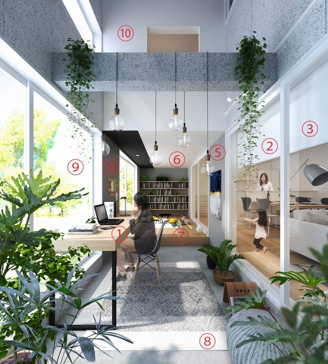 ⑦テレワークで問題なのが「ONとOFFの切り替え」。空間を区切ったONOFFの切り替えのみならず、ダブルスキンならちょっとしたくつろぎのスペースを造ることも可能です。休憩時間にはここでゆっくりとくつろぎ、仕事に戻った時の効率をアップさせましょう。