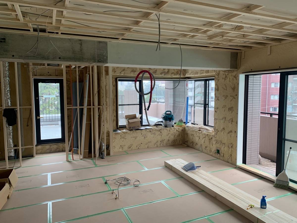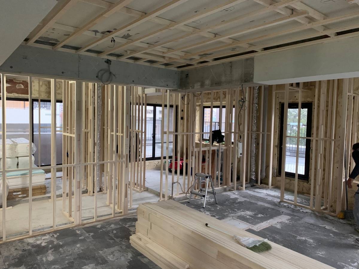 墨出し作業にて基準が決まったら、そこからどんどん壁や天井の木下地を建てていきます。いよいよ工事が始まったなということが目に見えてき始めますね。工事日数はお部屋の広さにもよりますが、平均的に100㎡くらいでだいたい実働で50日くらいかかりますので、約2、3ヶ月間の工事となります。