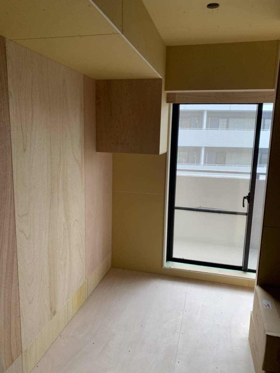 薄っすらと木目が見えている板はベニヤ板といって、造作家具等を取り付ける箇所の下地となる木材です。石膏ボードだけでは外れてしまうので、壁に固定が必要な家具や例えば重い額縁などはあらかじめ設置箇所を決めておき、ベニヤ下地をしっかりと入れておくことが重要です。