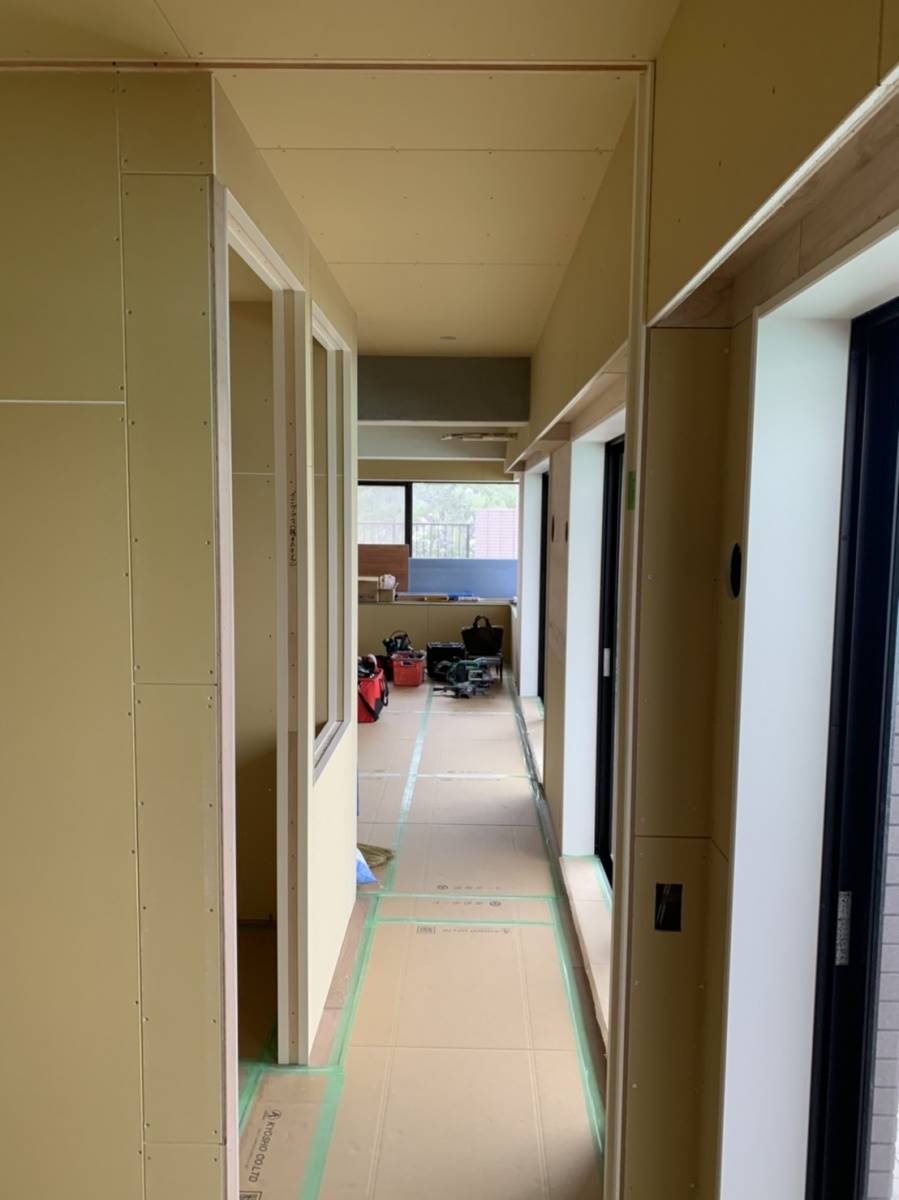 木下地の上にこのような石膏ボードが貼られます。どんどん壁ができあがってきます。