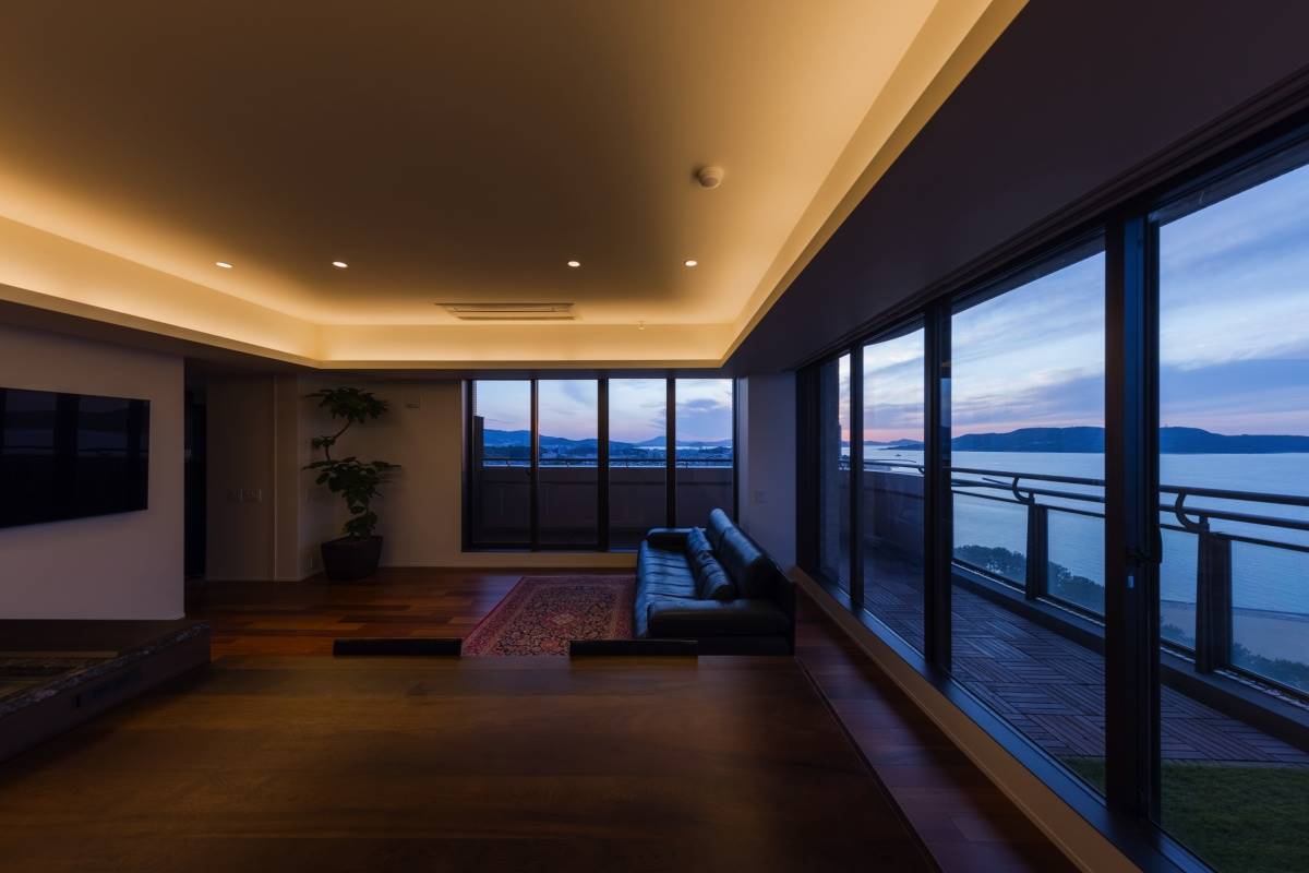 陽が沈んでいくのに合わせて室内を徐々にライトアップしていきます。天井面を照らす間接照明であかりの度合いをうまく調光しながら、その時間その時間で最も美しいライティングを楽しんでいただいております。