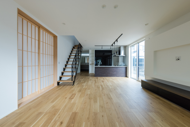 室内は、広いLDKと機能的な和室。日常の動線に沿った使いやすいプランであると同時にテラススペースのような豊かな空間もある。