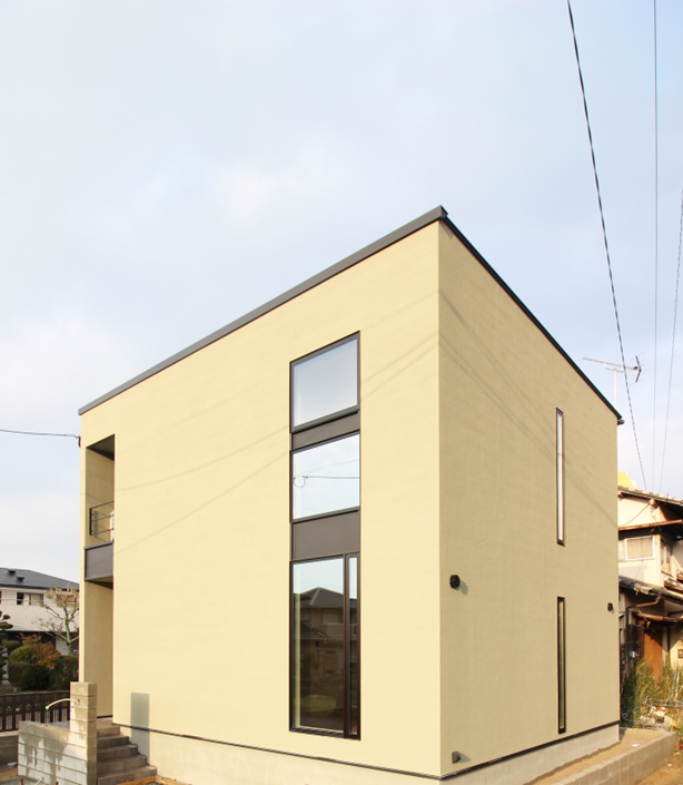 この家のシンボルは2階から1階まで伸びた窓です。上品な仕上がりの塗壁に、存在感のあるアクセントとして縦長の窓が配置されています。