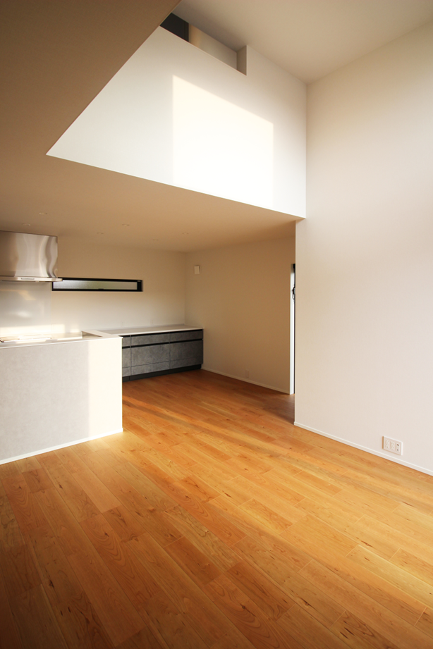 屋内のリビングは吹き抜けになっており、高い場所からの光がLDK全体に行き渡る心地よい空間が広がっています。