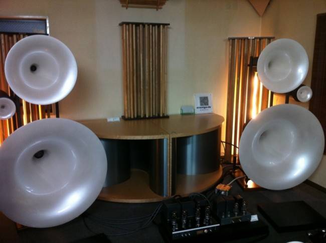 スピーカーも多く展示されていますが、その中でも異彩を放っていたのが、この大きいスピーカー(下段スピーカーは直径1メートルくらい!)と真空管アンプ。