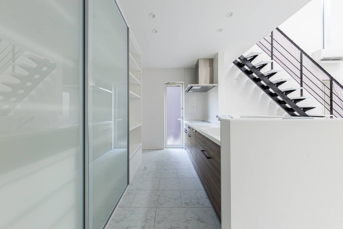 一方、こちらは石目調の床材を貼ったcube。木目とは違ってモダンでシャープな印象になります。階段も白で合わせています。