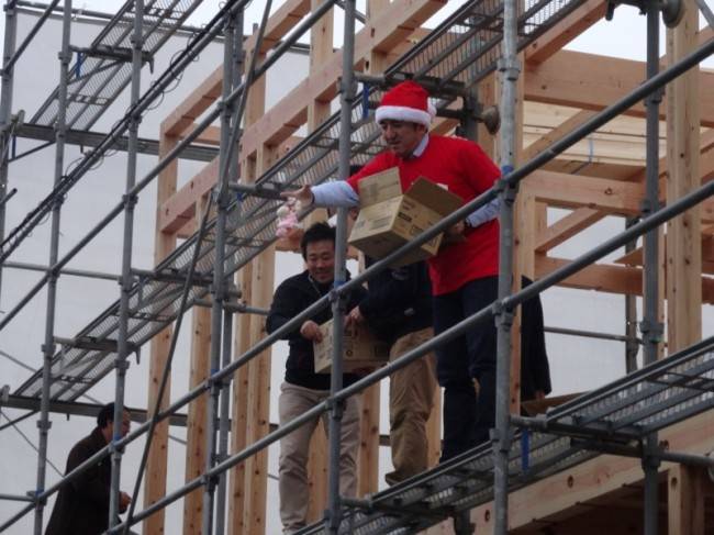 すると、ここでサプライズが!!この日は、25日。そう、クリスマスです。 お施主さまがサンタになり、来てくれたご近所の皆様に縁起物を振る舞いました!サンタが餅を・・・とちょっとミスマッチな組み合わせですが、良く良く考えてみると紅白餅と色が同じなんですよね?♪