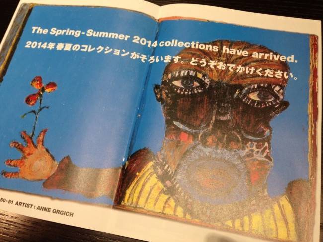 2013年は初の日本人アーティストとして大友克洋が選ばれ、年間全28冊を発送。11月には青山店やDOVER STREET MARKET GINZAなどでインスタレーションも実施された。「Raw Vision」は、1989年にイギリスで創刊。2014年に25周年を迎え、パリのHALLE SAINT PIERRE(アル・サン・ピエール美術館)で展覧会が開催されている(2014年8月22日まで)。2014年第1号として届いたDMは14ページにわたる冊子で、表紙にはタイトルとバーコードが配された。冊子中央の見開きは「Raw Vision」No.22の50-51ページに掲載されたANNE GRGICHの作品で、コム デ ギャルソンからの「2014年 春夏コレクションがそろいます。どうぞおでかけください。」というメッセージが印刷されてる。