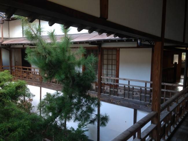 玄関から階段を上り2階に案内されました。磨き上げられた階段です。ピカピカ?!全体的にものすごく手入れの行き届いた建物でした。2階の廊下と中庭です。建物自体がロの字で中庭にある作りでした。部屋の中です。立派な床柱(これもピッカピカでした)天井の写真です。(かなり凝った作りになっていました)ちなみに部屋の名前が昔の女性の名前で当時の遊女?さんのお名前のようでした(ちょっと怖い・・・)