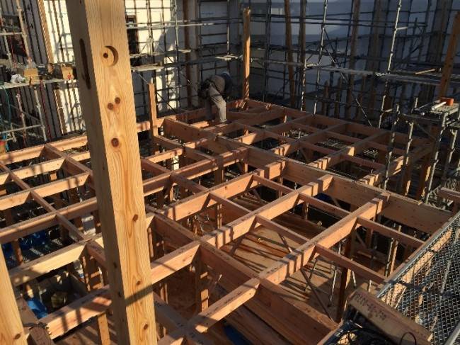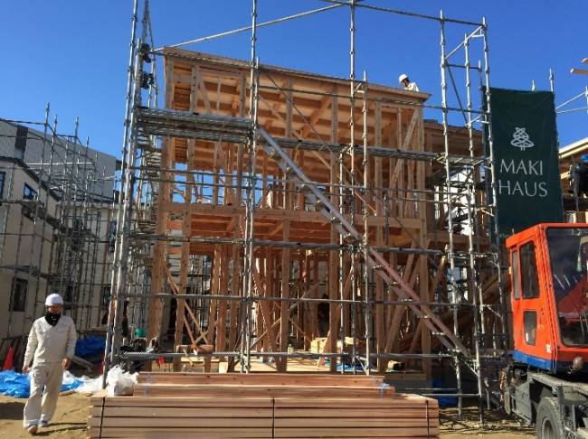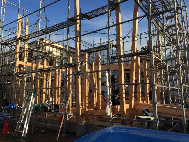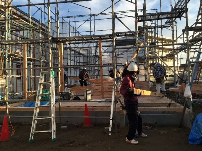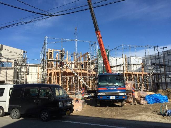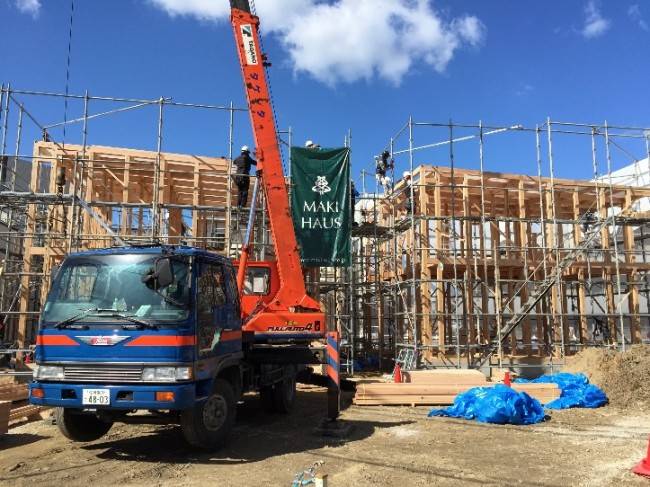 クレーン車のセットも終わり作業開始いたします。あっという間に柱が立ち並び次は2階の床組に入ります。クレーン屋さん出番です。2階床の金物締めと床下地合板貼りも終わり、次は2階の柱と小屋組みです。棟も上がりここまでくれば棟梁もひと安心でコーヒータイムです。休憩も終わり屋根の下地組に入ります。破風の取付けまで完了し屋根下地合板貼りです。だんだんと家の形になってきました。屋根防水シートの施工も終わり棟上げ完了しました。