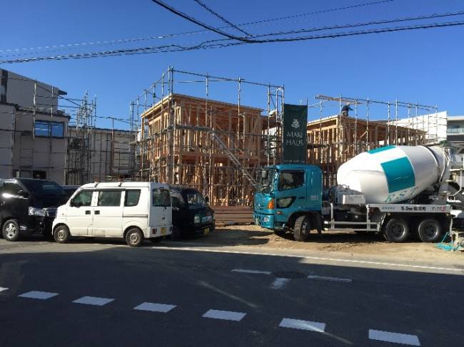 私は西区戸建賃貸PROJECTの現場担当しています。現在3棟(A・B・D 棟)は木工事中で、残り4棟(C・E・F・G棟)の建築予定で進んでいます。