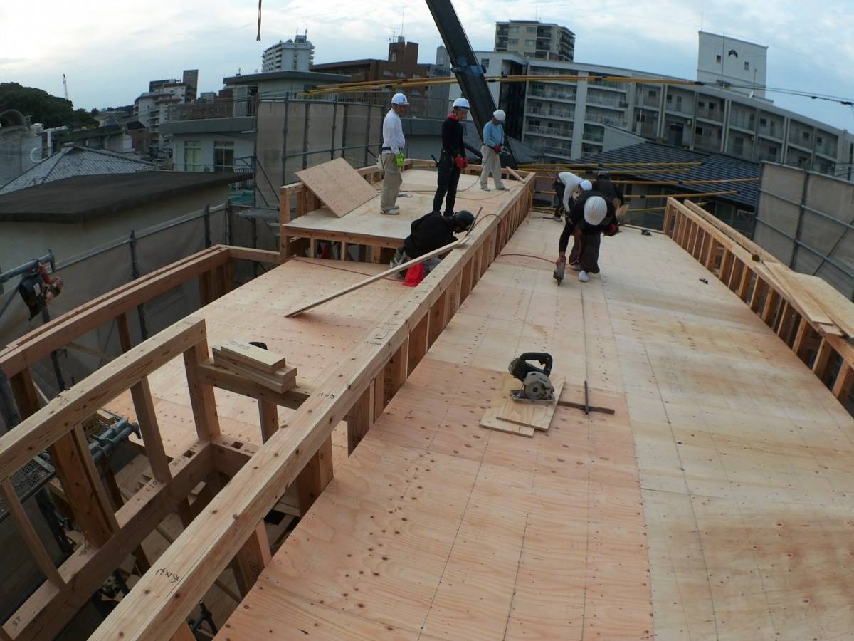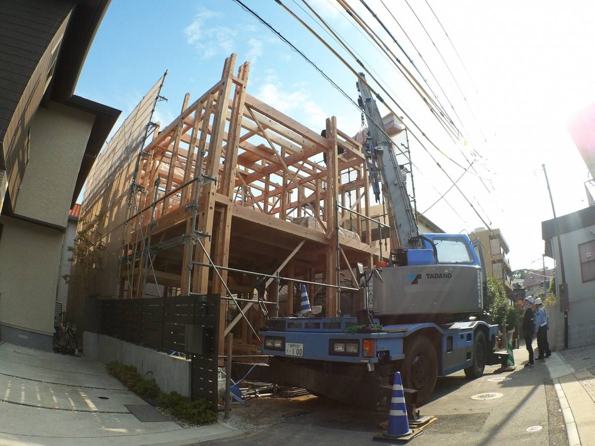 クレーンを使って、材料をどんどん運んで、