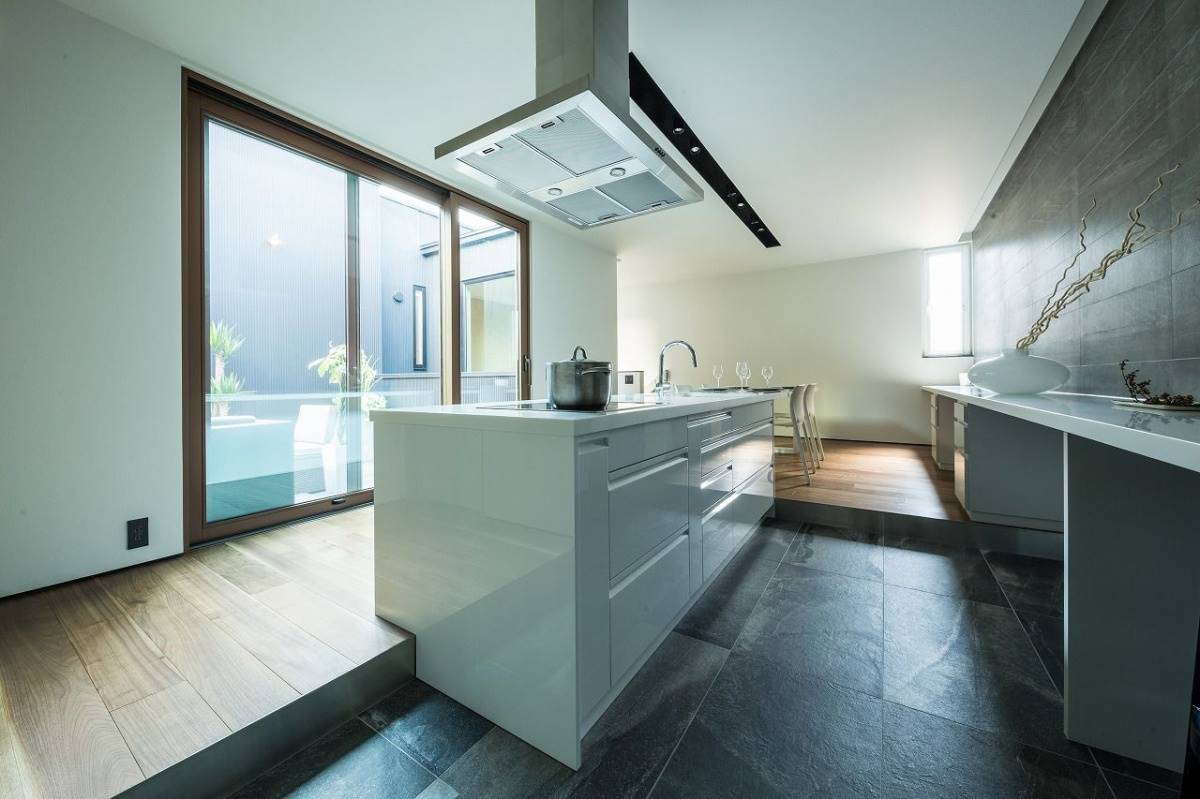 料理を作りながら、食事をしている家族や仲間と同じ目線で会話を楽しむために、キッチン部分はダイニングより一段下っています。