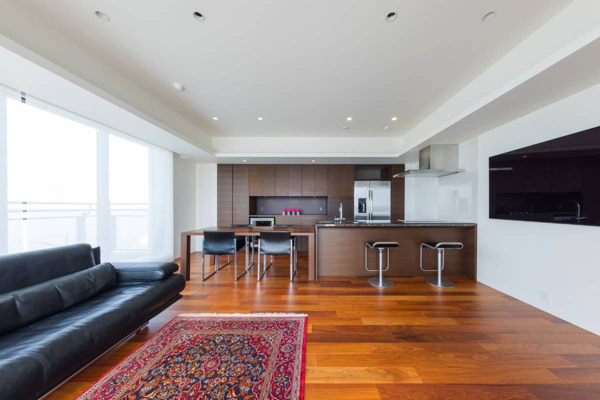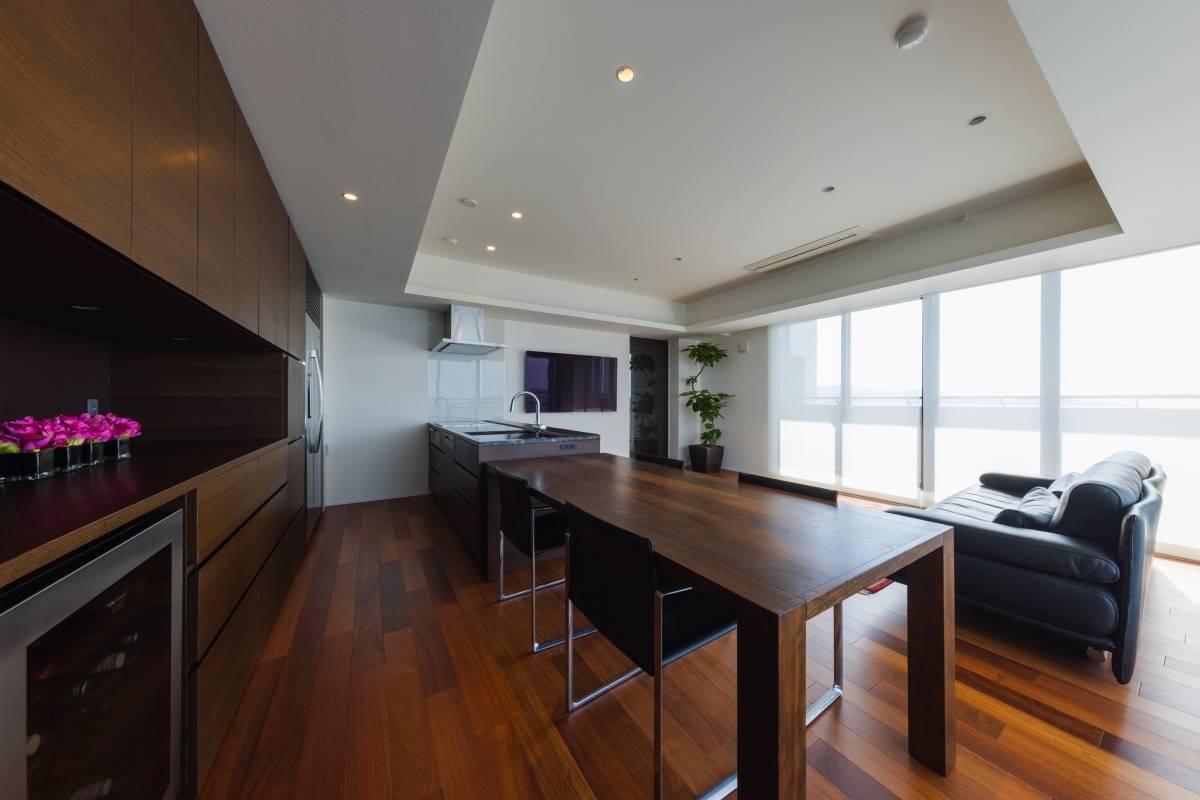 夕陽の見える海沿いのマンションリノベーション。美しい夕陽に負けない重厚感のある内装デザインに仕上げております。