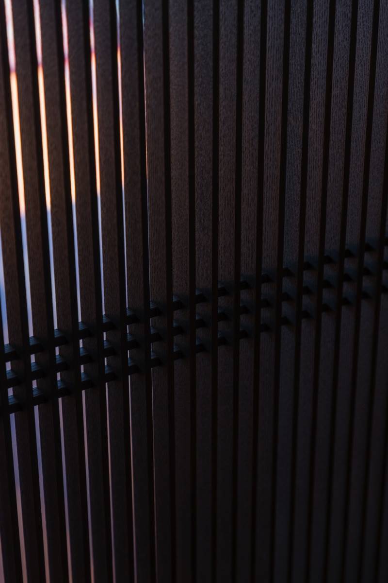 室内の要所要所にこちらのウェンジの格子をアクセントに配置しました。こちらもオリジナルなので格子の一つひとつの幅、間隔、高さ、そのベストな寸法をミリ単位で考えてデザインしております。