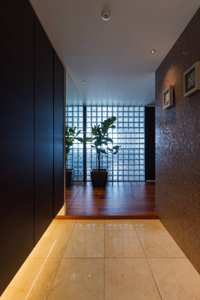 ガラスブロックを通して海沿いの光が玄関に差し込みます。土間のタイルはアドヴァンの「マジョルカ」という天然石。ベージュの本磨きの天然石でこちらも非常に高級感のある素材です。