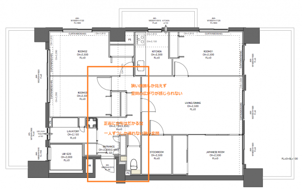 約100㎡もあるこの物件。全体的には広いはずなのに、玄関を開けたら狭い廊下とその正面には壁が立ちはだかり、全くその広さを感じることができなかったのがウィークポイントでした。