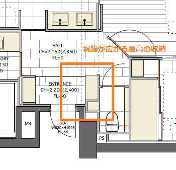 玄関収納を腰高の収納にし、視覚的に目線が広がりを持たせる。