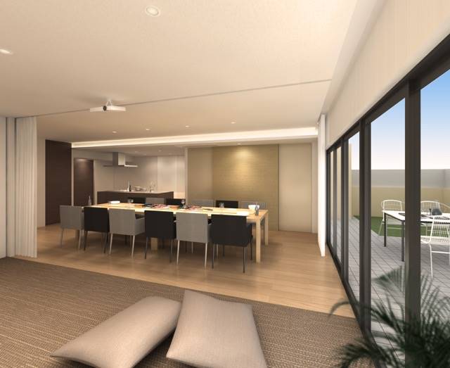 大きなダイニングテーブルが2台並びます。ここを中心に、キッチンにいる人、フリースペースでくつろいでいる人、バルコニーにいる人、それぞれの場所にいる人とコミュニケーションをとることができ、会話が弾みます。バルコニーも広く、セカンドリビングとして外での食事を楽しんだり子供たちが遊んだり、様々な使い方ができます。床の色は淡いオークで明るいくつろぎ感を演出しました。間接照明で天井部分を照らし、より空間に広がりが生まれます。