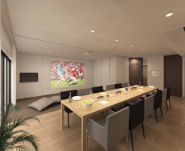 フリースペースのポイントは、フレキシブルに様々な用途で使えること。プロジェクターを使ってみんなで集まってサッカー観戦をしたり、映画を観たり。床材には「ボロン」という撥水性、耐久性に長けた塩ビ系のフロアタイルを使いますので、汚れも気になりません。サイザル麻や畳のような風合いですので、和室のようにお布団を敷いて寝るスペースとしても使えます。空間を仕切る際にはカーテンを引きます。カーテンは天井埋め込みのボックスタイプですので、レールが目障りになることもなく、カーテンを寄せている時に違和感がないように工夫しています。
