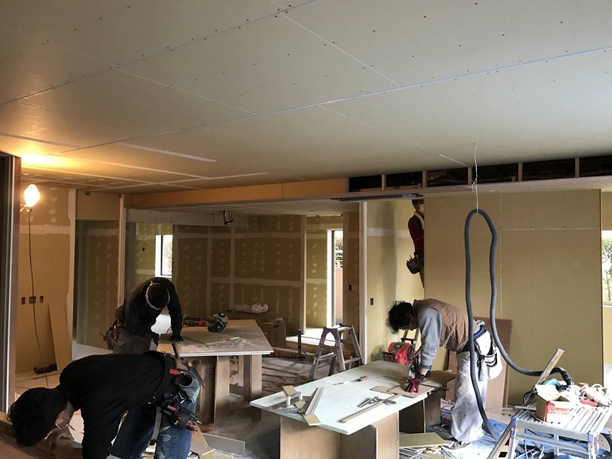 ボードが貼り終わるとようやく図面の通りに空間が見えてきます。木下地工事完了まで約一カ月。内装仕上げの工事に入る前のこの期間はなかなか空間のイメージがしづらく、一見、工事は進んでいるのかな…と思われるかもしれませんが、見えない部分の工事を着々と進めておりますのでご安心ください。リノベーションとはこれまであった住まいを再生させること。見た目が美しくきれいに生まれ変わるのはもちろんですが、このような住まいの基礎となる部分もしっかりと再生させ、これから先も安心してお住まいいただけるための土台を造ることが大切であると私たちは考えております。