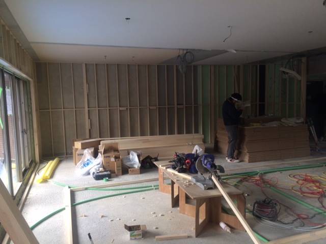骨組みとなる部分ができたら石膏ボードやベニヤ板を貼って壁や天井を造っていきます。(石膏ボード、ベニヤ板…このような建築資材についてもまたご紹介していきます。)