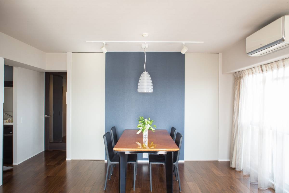 ダイニングテーブルのサイドにこちらの青いクロスを貼りました。のっぺりとした印象にならず、空間が引き締まって見えます。