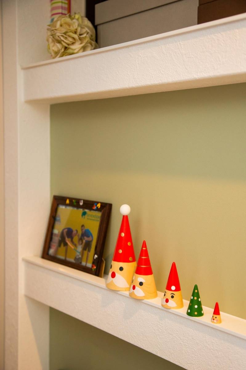 飾り棚の背面にアクセントを付けました。ちょっとした工夫で廊下の本棚が何か特別なものになりました。
