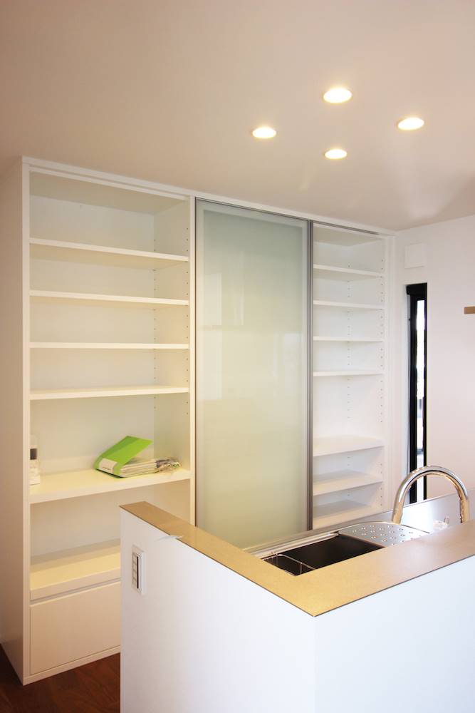 カウンターの後ろは、壁一面収納。