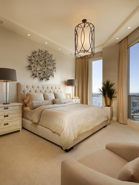 リビングやダイニングがフローリングならば、ベッドルームはカーペットにしてみてはいかがでしょう。素材を変えることで違った雰囲気になり、また絨毯やカーペットの温かい雰囲気が高級感を演出します。裸足で歩いても気持ちがよく足音も響きにくいので、実は寝室にはおすすめの素材です。
