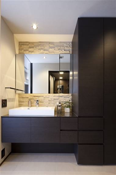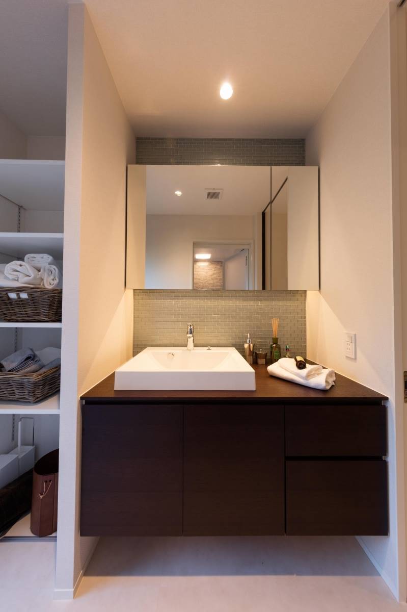 上のナチュラルな雰囲気の洗面室に比べて、洗面台の色をウォールナットなどのダーク系にするだけで一気に大人っぽい雰囲気の洗面室になります。このような洗面室には、落ち着いた雰囲気の出るガラスや石などの素材が合います。