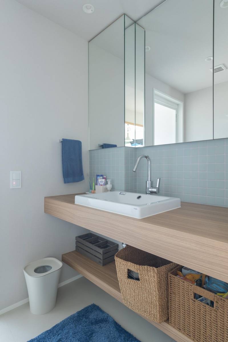 30?40代のご夫婦や小さなお子様がいらっしゃるご家族で大人気なのが、淡い色のタイルやオークなどの薄い色の木を使ったナチュラルな雰囲気の洗面室です。明るく開放的で、毎朝元気になりそうです。収納も造作家具としてではなく棚板を取り付けてカゴ類にタオルやサニタリー用品などを収納しますので、コストもカットできます。
