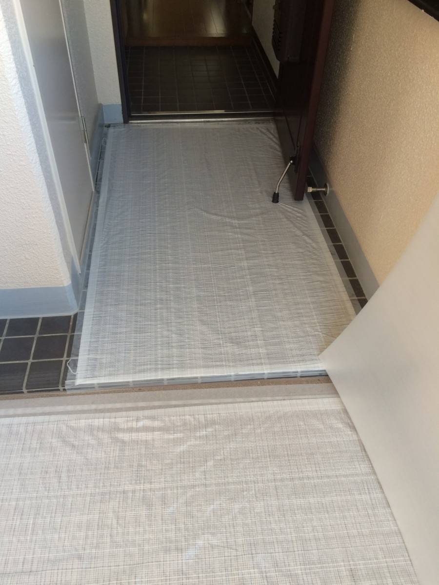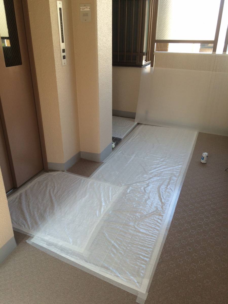 工事に入る前に必ず行うこと、それはマンションの共用部分の養生です。工事中、資材の搬出入によりエレベーターや廊下などの共用部分に傷がつくことがないよう、養生材でしっかりと保護していきます。
