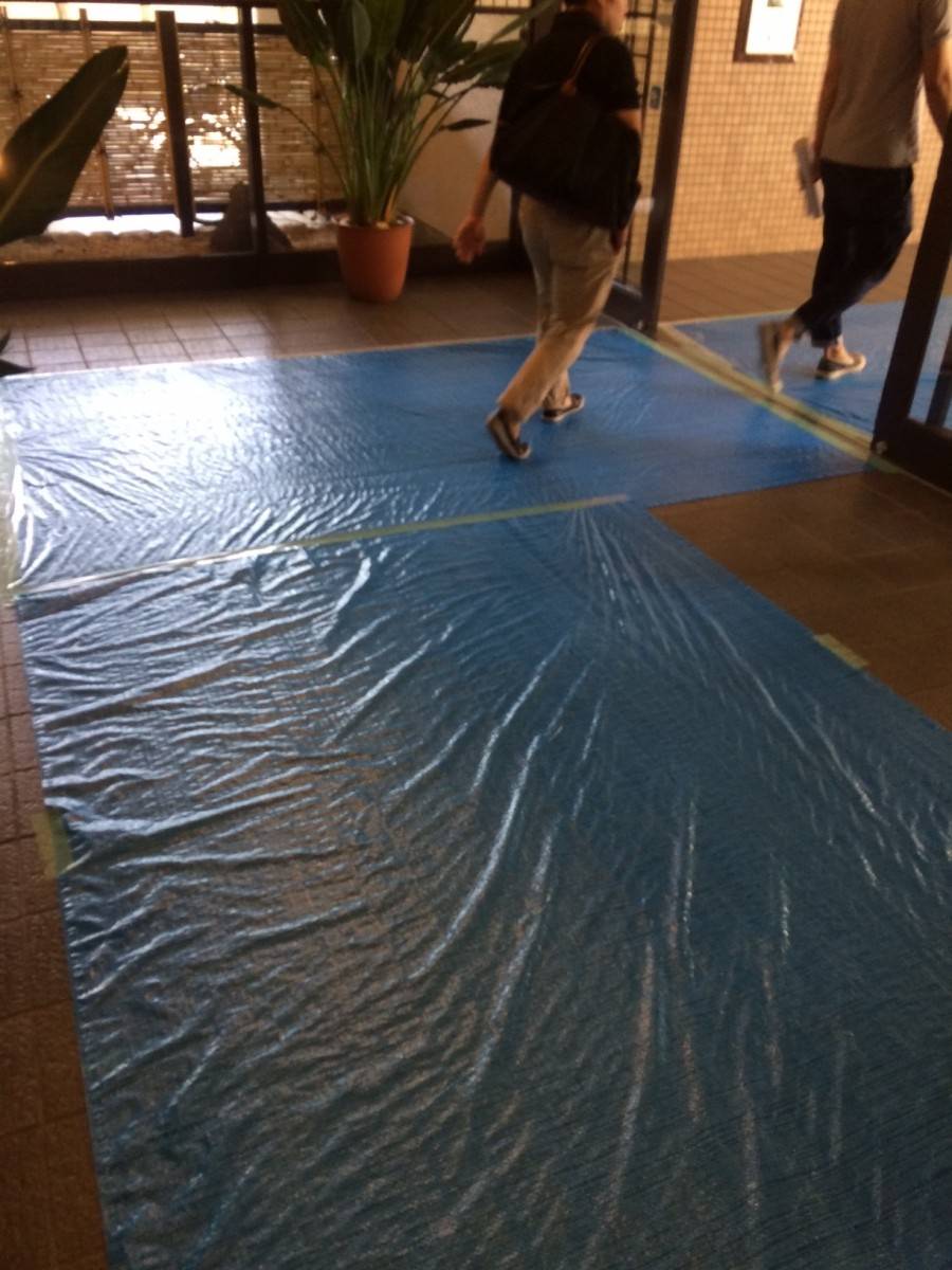 ?傷が付くことを避けるため、エントランスや廊下、エレベーターの中をこのようにしっかりと保護していきます。しかしながら、工事期間中このように養生だらけとなり、住人の方の中には不快な思いをされる方がいらっしゃるかもしれません。そのような近隣の方々への配慮も忘れずに、工事を進めてまいります。
