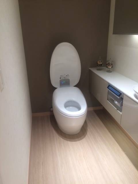 新しいウォシュレットNXは、蓋のヒンジの部分が別になっているだけで、後は機械部分と便座部分が一体となっています。後ろ姿も美しいですね。今までのトイレのイメージを覆す美しいデザインです。さすがはTOTO、トイレにまた新たな革命が生まれました。リノベーションカーサでも是非ご提案したい最新型トイレです。