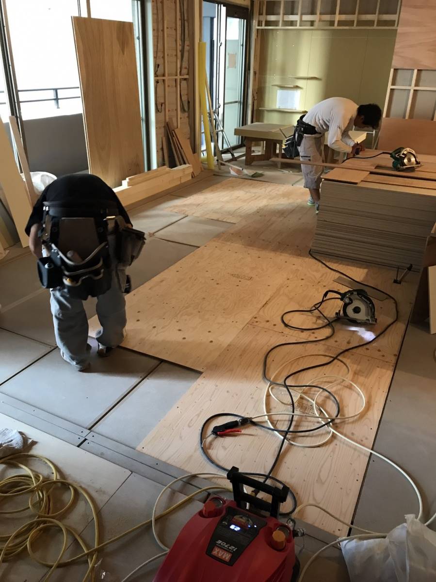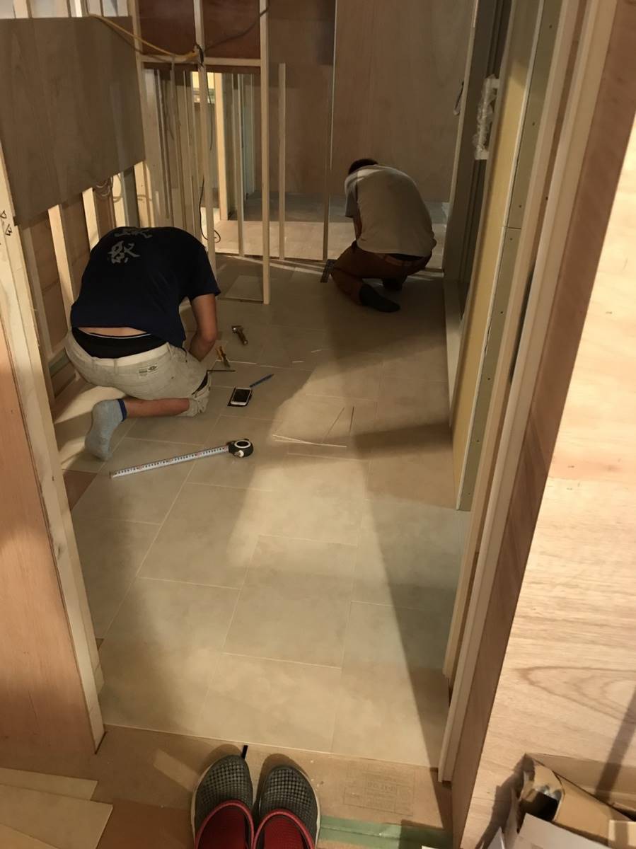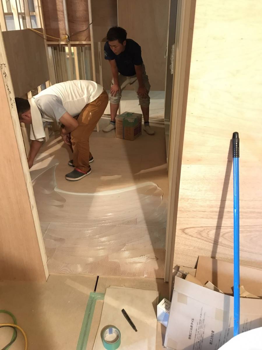 いよいよ内装工事スタート。こちらは洗面室のフロアタイルを施工しているところです。このように、衣装的な部分の工事は最後の方に行います。それまでは約40日間も造作工事が続きなかなか見た目の変化がみられませんが、造作工事が終わって内装工事が始まると一気に完成形が見えてきます。