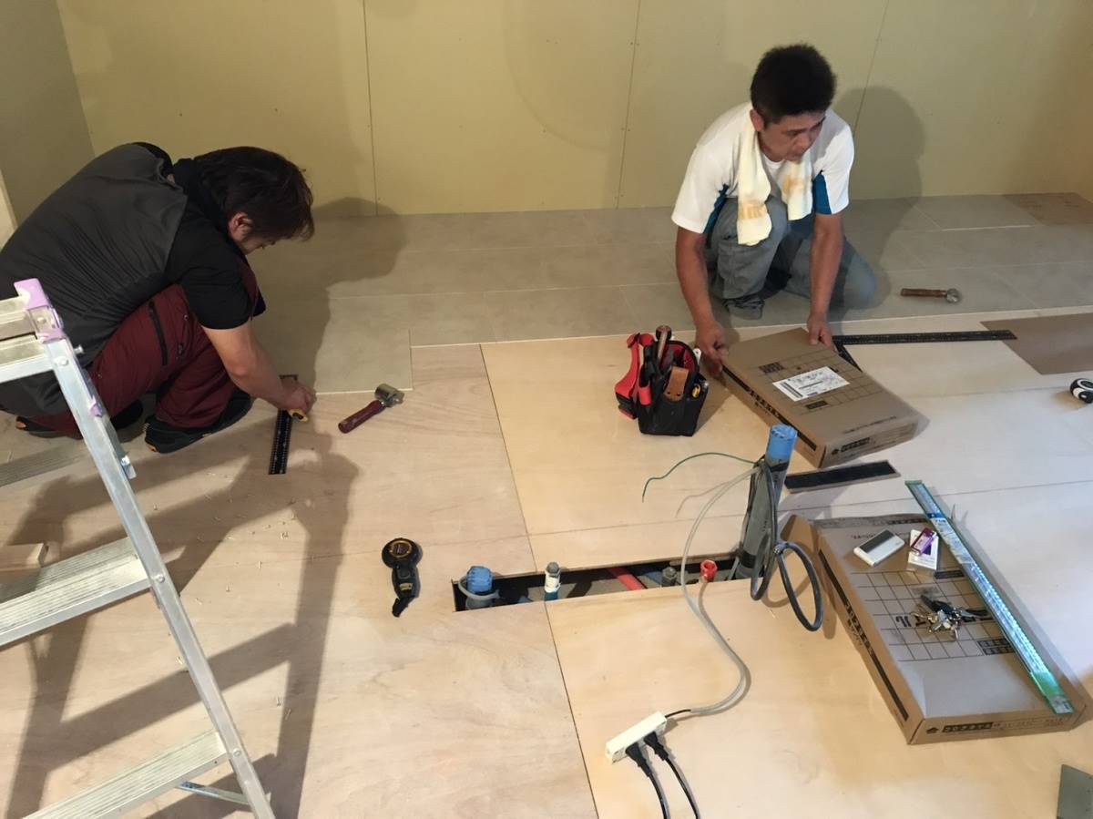 床暖房用の下地を貼っています。フローリングの下にこのような下地と床暖房用の機器が隠れていますので、これは後からはなかなかできない工事です。ですので、リノベーションは床暖房を導入する絶好のチャンスといえます。