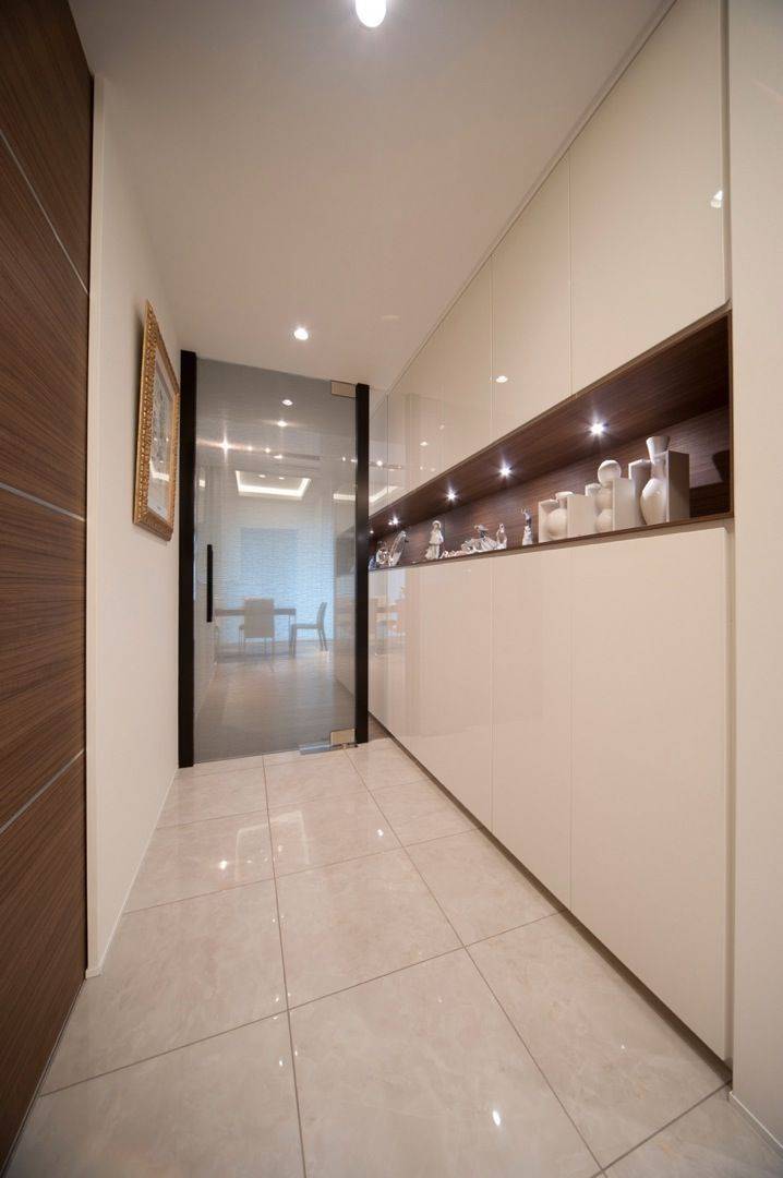 陶器のオブジェをコレクションされているオーナー様。長い廊下の一部にニッチを造ってそこに飾っていただきました。棚下にはダウンライトを入れて、コレクションの数々を照らしています。